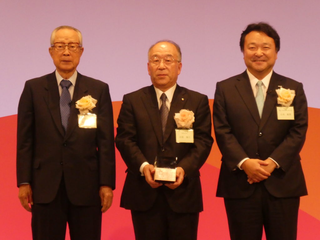 記念撮影する高橋社長(中央)と今井審議会会長(左)、山本社長
