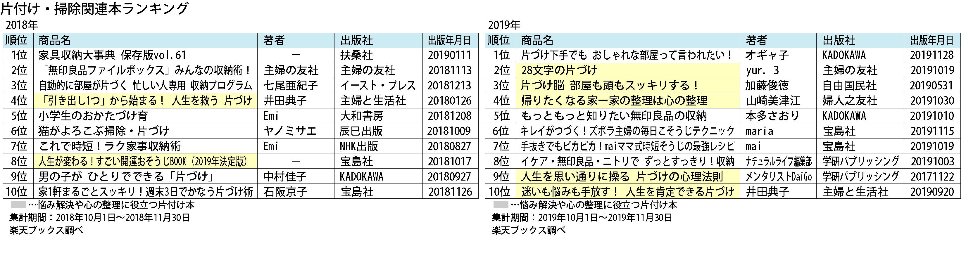 19年は、脳科学や心理学の側面から片付けを解き明かした本や、片付けにまつわる人生観をつづった本などの売れ行きから、片付けを通した習慣の見直しや片付け意識の高まりが読み取れ取れました。