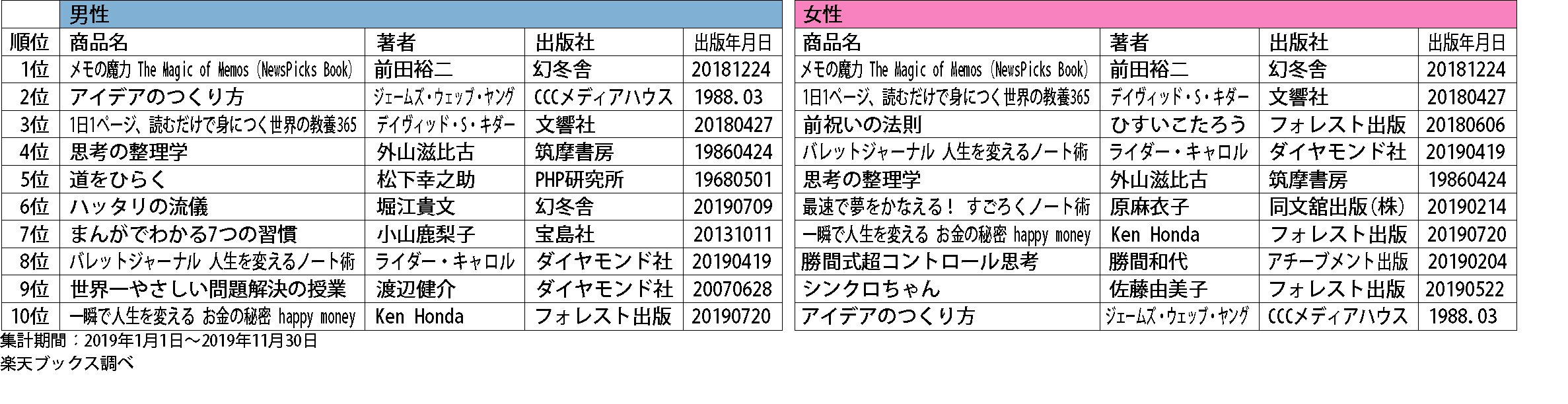 自己啓発本の購入者層の男女比は、約6:4で男性が女性を上回る結果となり、男女のランキングはともに1位に『メモの魔力』がランクインしました。