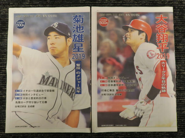 岩手日報社は12月16日、岩手県出身メジャーリーガーの大谷翔平選手(エンゼルス)と菊池雄星投手(マリナーズ)の2019年シーズンをそれぞれ振り返る岩手日報特別版(上質紙タブロイド判、32㌻オールカラー、各550円・税込み)を発行した。それぞれの昨年1年間の活躍を、本紙