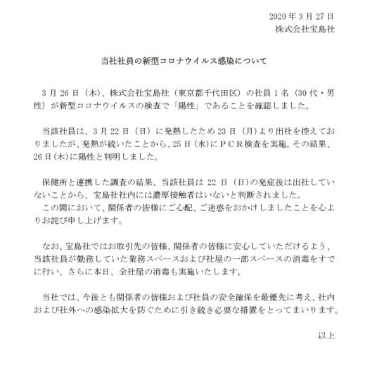 宝島社は3月27日、自社のホームページで、30代男性社員が新型コロナウイルスに感染したと発表した。発表によると、感染した男性社員は3月22日に発熱し、23日から出社を控えていた。しかし、発熱が続いたことから25日にPCR検査を受け、26日に陽性と判明した。