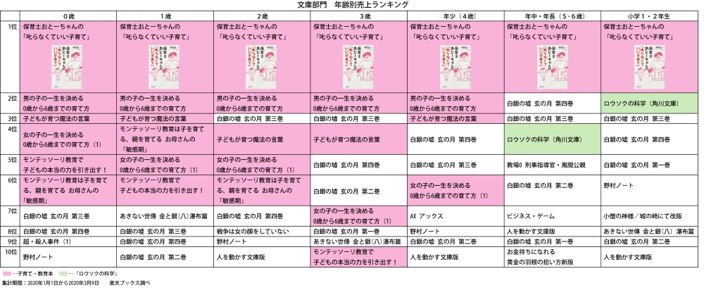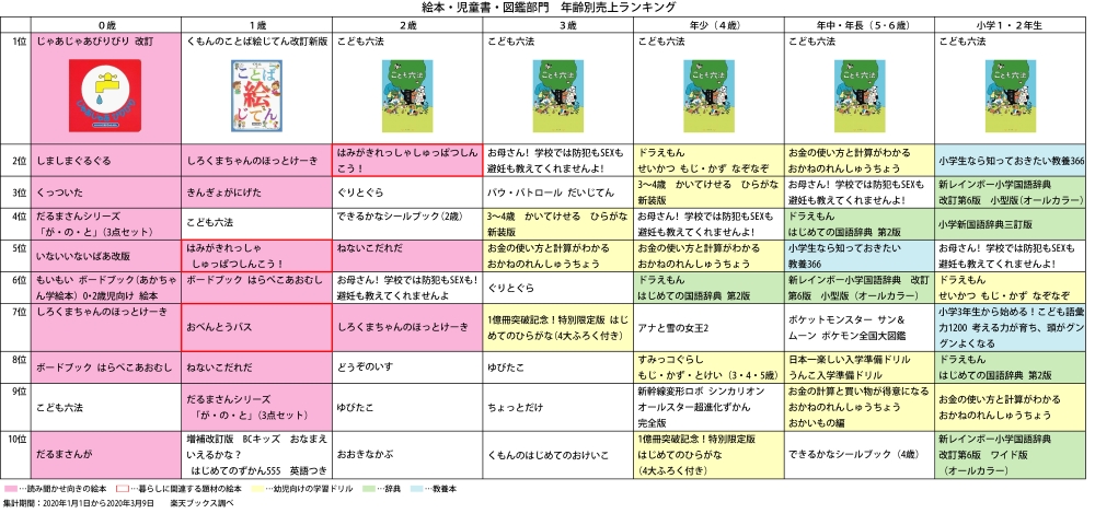 また、「楽天ブックス」と「楽天ママ割」の双方を利用する会員データを基に、子育てに関する書籍3部門「絵本・児童書・図鑑部門」「美容・暮らし・健康部門」「文庫部門」で、子どもの年齢別売上ランキングも発表した。