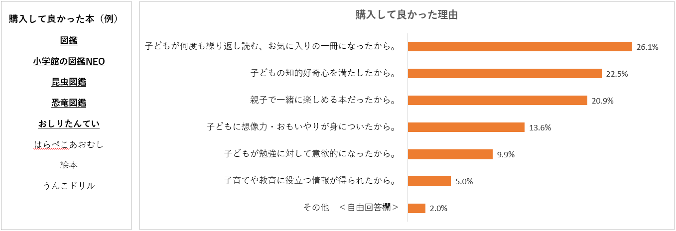 調査によると「購入して良かった本」について、年少(4歳)以下の子を持つ親は読み聞かせの「絵本」、年中(5歳)・年長(6歳)の子を持つ親は「図鑑」の回答が目立った。小学生の子を持つ親の回答では、小学校の勉強に役立つ学習ドリルなどが挙げられ、理由は「子どもが勉強に対して意欲的になったから」が最多となった。小学校3年生以上の子を持つ親の回答のみで見ると、「子どもの知的好奇心を満たしたから」が理由の24.0%を占めている。