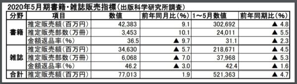 出版科学研究所によると5月期の書籍・雑誌推定販売金額は770億1300万円、前年同月比1・9%増となった。書籍が同9・1%増と大幅に伸びたためだが、販売状況は改善しておらず、休業店の商品や休校に伴う学校採用品の返品が行われず返品が減少したためと