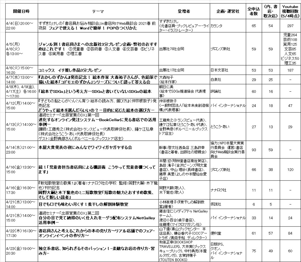 このほか、12のオンラインセミナーやトークイベントを開催。最も多くの書店員がリアルタイムで参加したイベントは「本屋大賞発表の夜にみんなでワイワイガヤガヤする会」だった。
