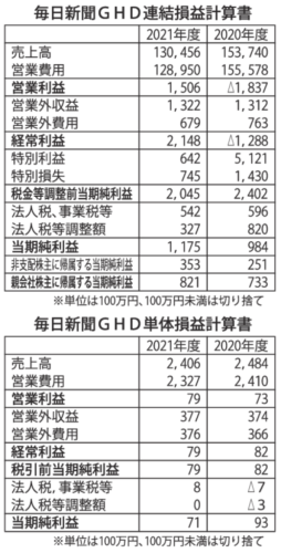 毎日新聞グループホールディングス(GHD)の2021年度(21年4月~22年3月)決算がまとまった。連結は27年7カ月ぶりとなる毎日新聞本紙の価格改定やグループ各社の経費削減策などによって、営業損益、経常損益とも3期ぶりに黒字に転換した。毎日新聞GHD単体も11期連続