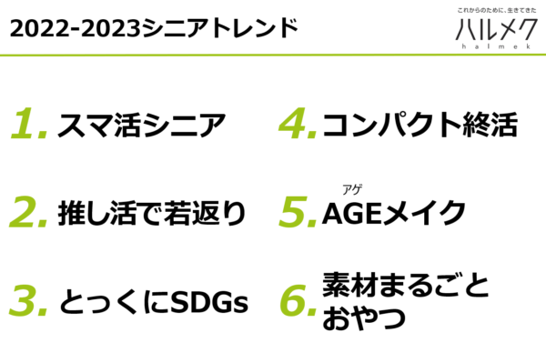 女性誌『ハルメク』をグループで発行する株式会社ハルメクホールディングスの「ハルメク 生きかた上手研究所」は12月7日、2022年のシニア世代の動向を振り返り、「2022-2023シニアトレンド」(出典:ハルメク 生きかた上手研究所調べ)を発表した。「スマ活シニア」「推し活で若返り」「コンパクト終活」など、現在のシニア世代の動向を明らかにした。