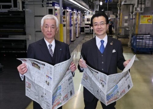 委託拡大を控えた2月21日、朝日新聞社の中村史郎社長(写真右)と河北新報社の一力雅彦社長(同左)が河北新報印刷センターを訪れ、新しい輪転機などを視察した。