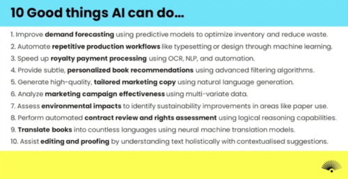 AIが出版ビジネスに貢献できること。①需要予測②生産合理化③印税など分配の効率化・・・(フランクフルトメッセでのShimmer社の発表資料より)
