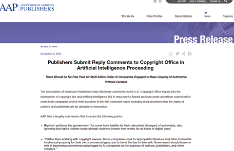 AAP(米国出版社協会)は12月6日、学習利用がフェアユースでないことなどを主張する声明を発表