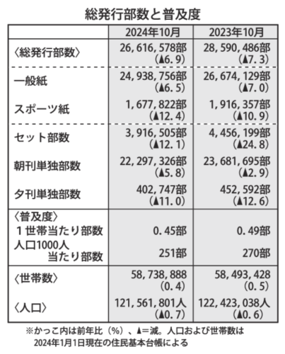 24年10月の新聞総発行部数は2661万6578部 20年連続で減少 日本新聞協会調べ