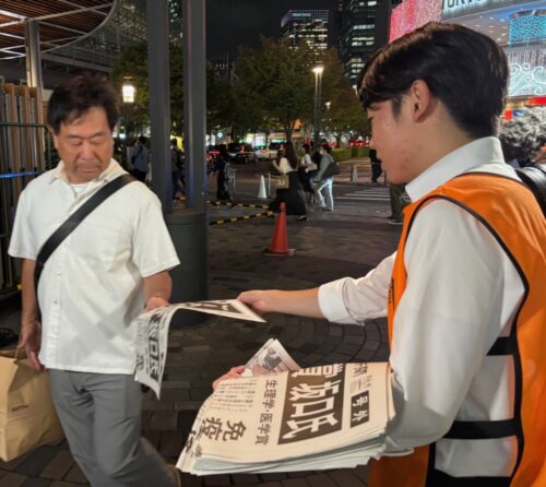東京・有楽町駅前では、19時半頃から配布が始まり、号外を受け取った帰宅中の会社員らは驚きや喜びの表情を見せていた。