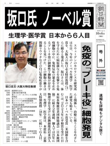 朝日新聞社は10月6日、大阪大学の坂口志文特任教授が今年のノーベル生理学・医学賞に決まったことを受けて、輪転号外を発行し、同日19時半から、東京・新橋駅SL広場前で街頭配布した。