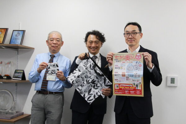 左から取締役・編集第2本部長の殿塚郁夫氏と主婦と生活別冊編集 編集長束田氏、取締役・営業本部販売担当の沼尾氏。殿塚氏と束田氏が手にしているのは付録の「MOOMIN リトルミイ2WAY保冷バッグ」