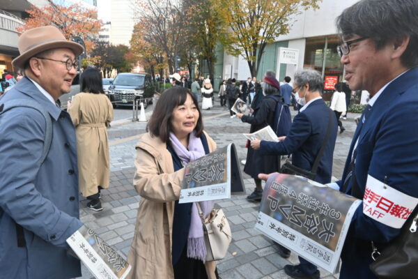 岩手日報社は11月14日、岩手県奥州市出身で米大リーグ、ドジャースの大谷翔平選手のナ・リーグMVP選出を記念した特別号外4万5000部を発行し、東京都内と岩手県内で配布した。 JR有楽町駅前では、大勢のファンが配布を心待ちに待機