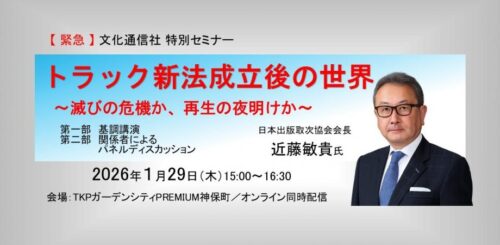 株式会社文化通信社は2026年1月29日(木)、【緊急】文化通信社 特別セミナー「トラック新法成立後の世界 ~滅びの危機か、再生の夜明けか~」を開催します。第一部で日本出版取次協会会長の近藤敏貴氏(株式会社トーハン代表取締役会長)が、出版流通の現状と喫緊対策、さらに中長期的に目指すべき方向性について話します。第二部では関係者によるパネルディスカッションを行います。