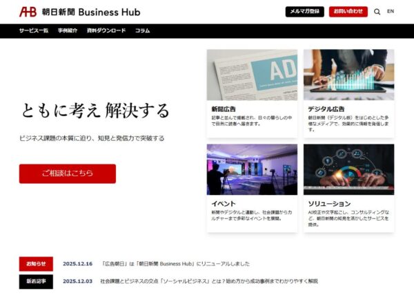 朝日新聞社は、マーケティングに関する情報ポータルサイト「広告朝日」をリニューアルし、「朝日新聞BusinessHub(ビジネス・ハブ)」に刷新した。ビジネス課題解決に役立つ情報を届けする中心(Hub)になることを目指す。 同社は1960年に