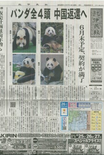 30年パンダを飼育してきた白浜町のレジャー施設「アドベンチャーワールド」。日々パンダの話題を紙面で扱ってきたが、全4頭の返還が決定。中国へ旅立つその日まで、写真とともに報道を続けた。