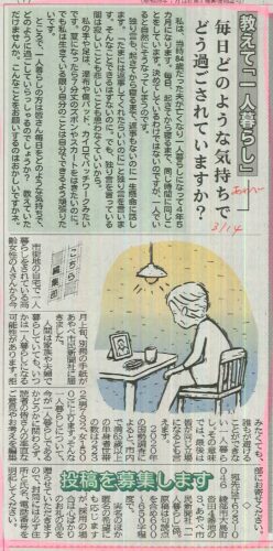 まるでラジオ番組に寄せられたお手紙のようでDJが読み上げる姿までが想像できるような市民の方から届けられたリアルな投稿。それをきっかけに展開された記事だが、核家族、高齢化が進むこの時代に同じような悩みを抱えている人はきっと多いはず。このコーナーがみんなで意見交換できる交流の場になり地域の人のよりどころの1つになると良い気がした。【横川正紀】