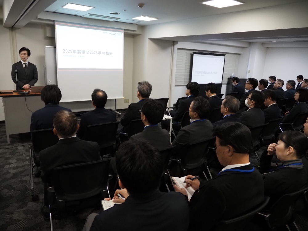 東京新聞(中日新聞東京本社)の新年合同専売会が1月21日、東京・千代田区のTKP新橋カンファレンスセンターで、首都圏の専売店店主約130人が参加して開かれた。本社側は、大島宇一郎代表取締役社長、大場司常務取締役東京本社代表、大島久直取締役販売担当、山田清司販売局長、中