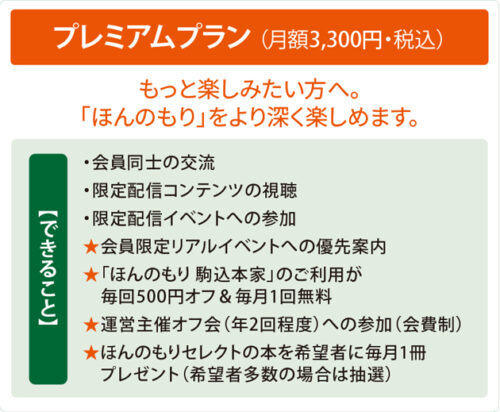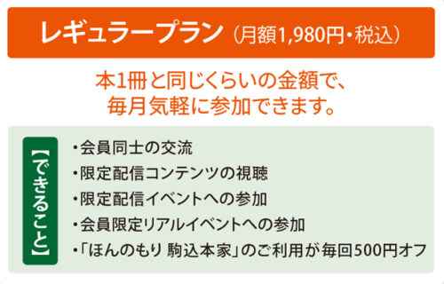 レギュラープランの全機能に加え、ほんのもりセレクトの本を希望者に毎月1冊プレゼント。「ほんのもり駒込本家」を毎月1回無料で利用できます。会員限定のリアルイベントへの優先案内など、オンラインとリアルの双方でより深くコミュニティを楽しんでいただける内容となっています。