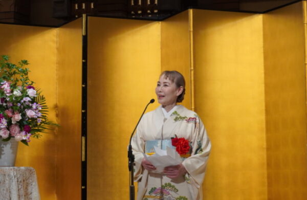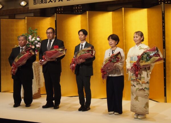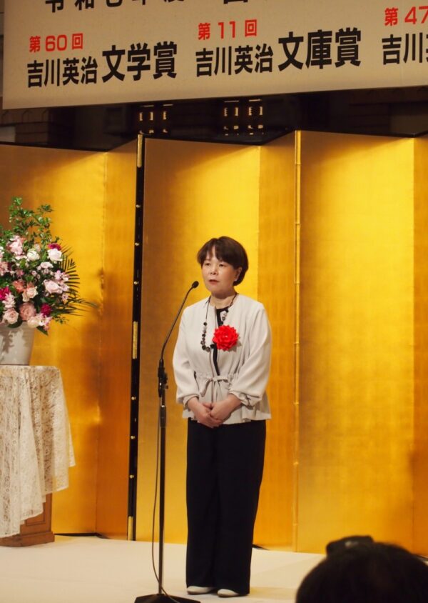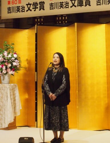 吉川英治文学新人賞を受賞した伏尾さんは「編集、校正をはじめ、作品に関わったたくさんの方のおかげで今、この場に立てている」と感謝の意を述べ、「受賞を励みにさらにステップアップして、またこの晴れ舞台に戻ってきたい」と語った。