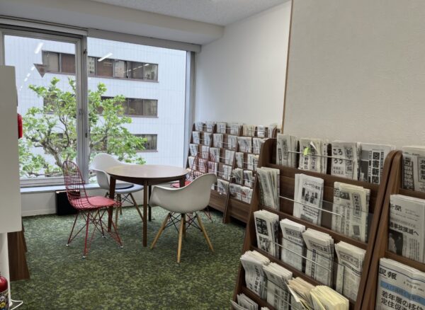 大きな窓のある明るいライブラリー。日本全国の新聞を読むことができる