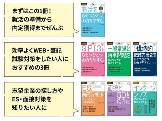 ▲自己分析、面接、SPI対策など、選考プロセスや自分の苦手ポイントに合った1冊を選べます。