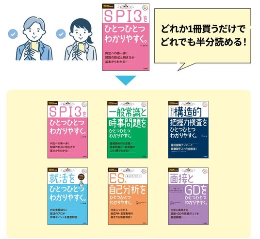 「就活をひとつひとつ」シリーズのどれか1冊を買うだけで、シリーズ6冊のそれぞれ半分をスマートフォンやタブレットで読むことができる「シリーズ全冊 本の半分がスマホで読めちゃう」キャンペーンを実施中※。いつでもどこでも読むことができるので、ちょっとしたスキマ時間での対策に、本番前のおさらいに活用できます。