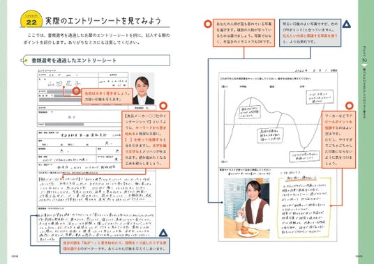 ▲内定を獲得した先輩たちの実例や生の声が満載! 実際に書類選考を通過した先輩のエントリーシートも掲載しているので、書き方が具体的にわかります。(『エントリーシートと自己分析をひとつひとつわかりやすく。』より)