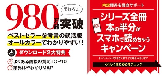 2大ダウンロード特典「よくある面接の質問TOP10」「業界はやわかりMAP」や、「シリーズ全冊 本の半分がスマホで読めちゃう」キャンペーンなど、就活に役立つコンテンツが盛りだくさん!