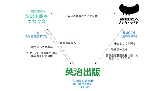 当社は出版企画の決定を全員の対話によって行い、人材採用や賞与分配等の意思決定にも全メンバーが主体的に関与する組織文化を築いてきました。子会社となるに当たっても、「英治出版らしさ」を保つこと、参加型の経営をさらに進めることを念頭に、社名とパーパスの変更について拒否権を持つ種類株式1株を、従業員のみで構成する一般社団法人英治出版をつなぐ会(従業員間で選出された下田理が代表理事に就任)に付与しました。また、子会社化した後も当社の経営・組織運営の自律性とメンバーの経営参加が尊重されることをカヤックと合意し、同社団法人も加えた三者間の合意書を締結しました。
