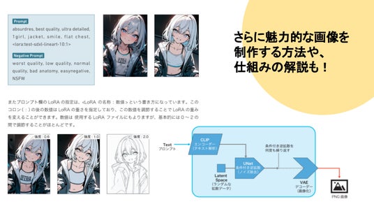 また、既にAIを活用している方にもご満足いただけるように、よりAI画像制作を極めるヒントとなるようなStable Diffusionを含むAI画像生成を利用した作例のメイキング方法やプロンプト構成/生成パラメーターなどの情報を公開・解説しています。ハンズオン形式で最後まで取り組むことで、画像生成AIへの理解をより深めることができる1冊となっています。