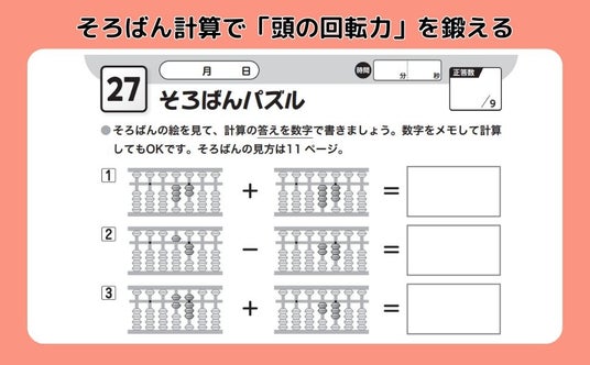 子どものころに習った「そろばん」のイラストで、簡単な計算を繰り返します。難しい計算をやるよりも、どんどん解ける簡単計算をテンポよく繰り返すことで【頭の回転力=情報処理力】がアップします。
