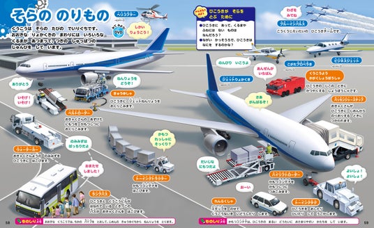 乗り物の種類だけでなく、しくみも解説されているので、物理、 工学系の知識が感覚的に身につき、社会、街や流通など幅広い知識に興味を持てるしかけがたくさん詰まっています。