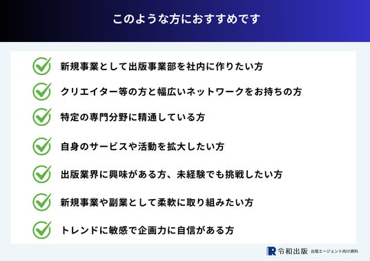 - 新規事業として出版事業部に作りたい方(個人事業主の方も歓迎)