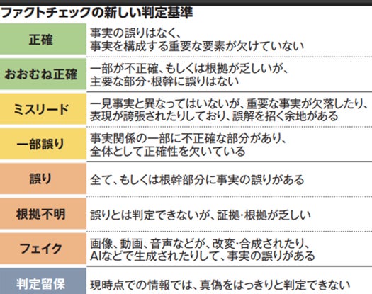 朝日新聞は21年9月から、認定NPO法人「ファクトチェック・イニシアチブ」が作った9段階の基準に基づき判定してきました。態勢を強化するのを機に、朝日新聞として独自の基準を作りました。8段階で判定します。画像や動画、音声などの真偽についてもチェックすることにしました。