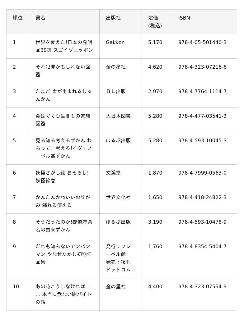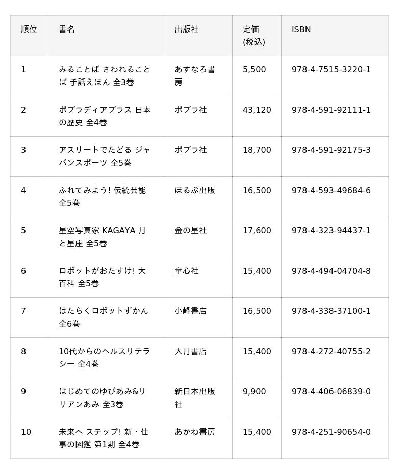 - 例年、トーハンが全国で実施している図書館スタッフ向けの本の展示会「児童図書・優良図書展示会」において、最も多く選書された本を発表する企画です。- 1回目となる今回は、2025年4~10月にかけて全国59会場で実施し、のべ約4,000人が来場した展示会での選書データを集計。約3,400点・12,000冊の展示商品の中から、セット・単品のそれぞれ上位1~10位を発表します。