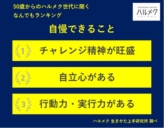 販売部数No.1(※1)雑誌「ハルメク」などのマーケティングやリサーチのコンサルティングを通じて、50代以上のインサイトを日々探求する「ハルメク 生きかた上手研究所」は、50歳以上の女性(事前調査524名、本調査498名)へのアンケート結果をもとにした「50歳からのハルメク世代に聞く なんでもランキング」を公開しました。テーマは「自慢できること」です。