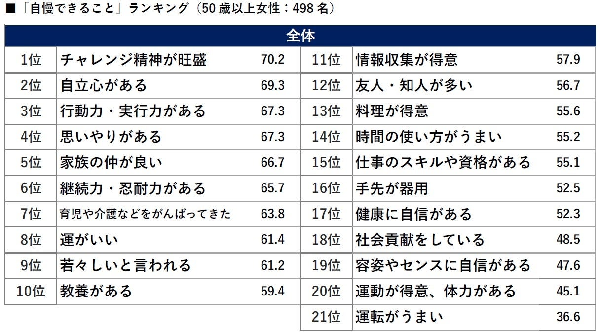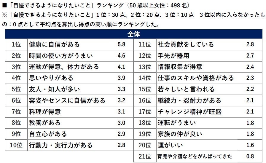 人生を折り返した50代以上の女性が「自慢できること」として挙げた上位は、資格や肩書き、派手な成功ではありませんでした。「チャレンジ精神が旺盛」「自立心がある」「行動力・実行力がある」といった、生き方そのものです。経験を重ねてきたからこそ培われた、自分の姿勢や態度への自負がうかがえます。一方で、「自慢できるようになりたいこと」では、「健康」「時間の使い方」「体力」と、身体や時間に関する項目が上位を占めました。行動力や挑戦意欲はある。でも時間と体が追いつかない。もっと動けたらいいのに・・そんな本音が透けて見えます。