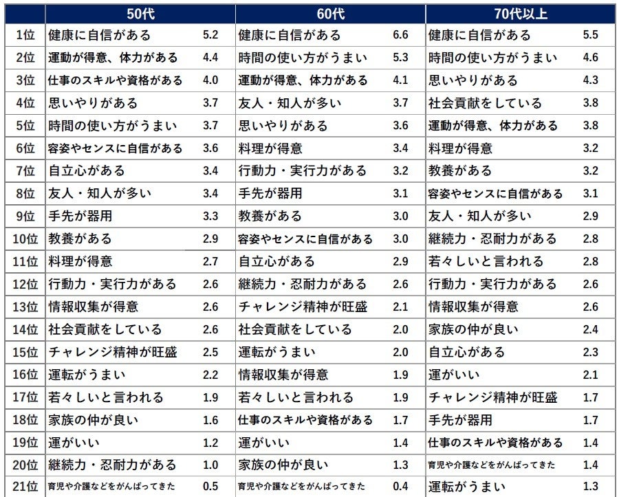 3位は「運動が得意、体力がある」。50代では2位、60代では3位、70代以上で5位だった。