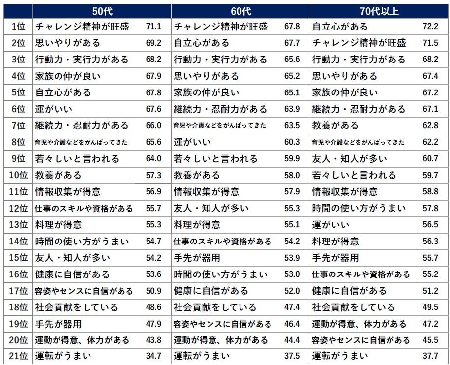 1位は「チャレンジ精神が旺盛」。50代・60代で1位、70代以上で2位だった。