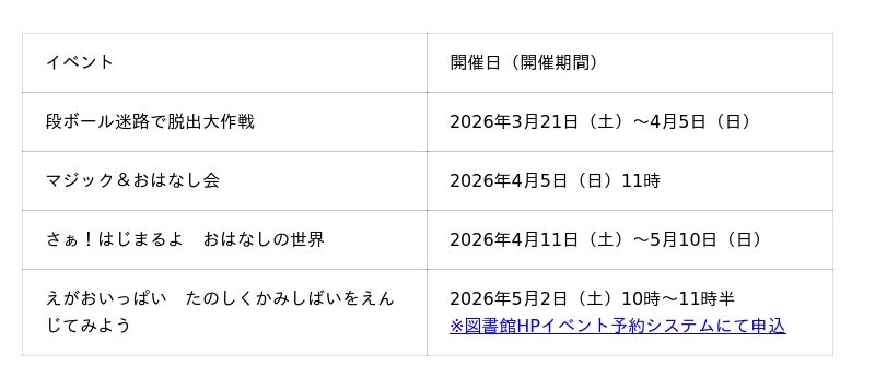 子どもたちが楽しみながら本に親しめるよう、豊橋市の図書館では、子ども読書の日・こどもの読書週間記念イベントとして、2026年3月21日(土)から「図書館こどもフェスタ」を開催しています。