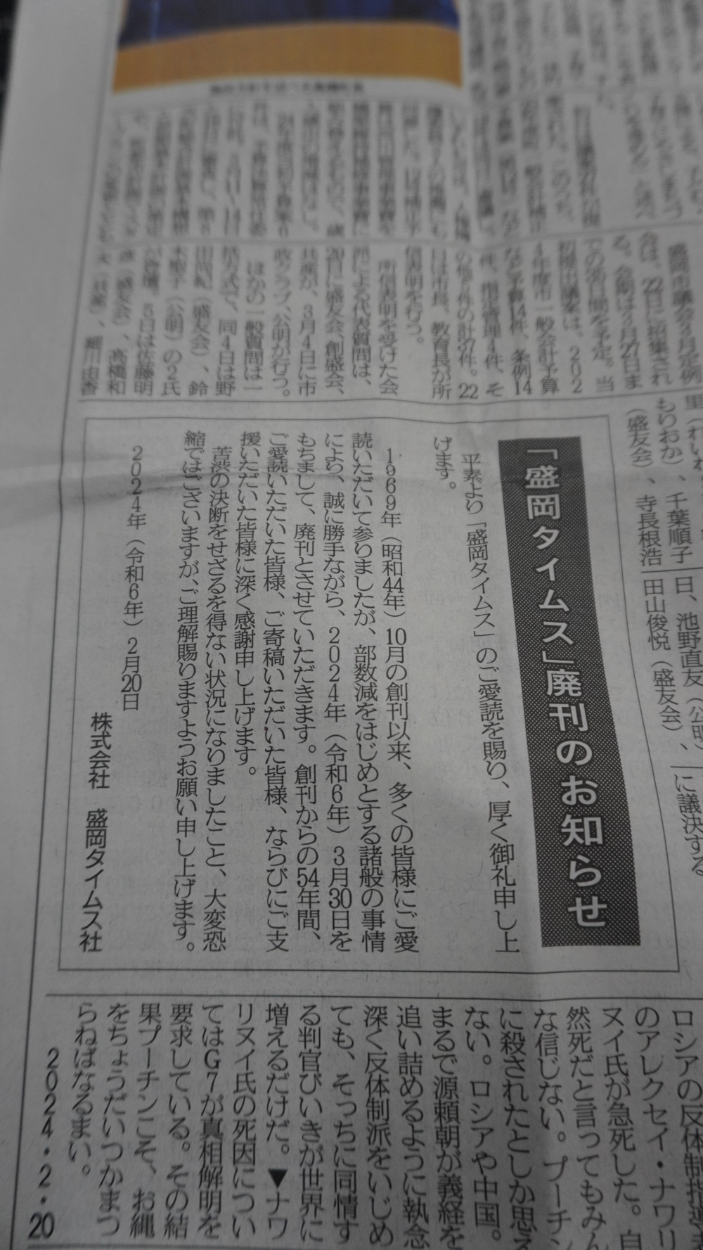 地域紙「盛岡タイムス」(岩手県盛岡市) 3月末での廃刊を発表 廃刊, 盛岡タイムス, 盛岡タイムス社| ニュース 新聞2月20日 岩手県盛岡市などの周辺3市5町を発行エリアとする地域紙「盛岡タイムス」を発行する盛…続き
